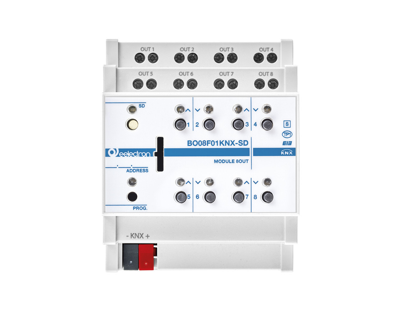 Version BO08F01KNX-SD includes a microSD card reader with which you can save the programming of the device to be able to restore it on an identical device in order to avoid programming in field or to allow a fast restore in case of failure.